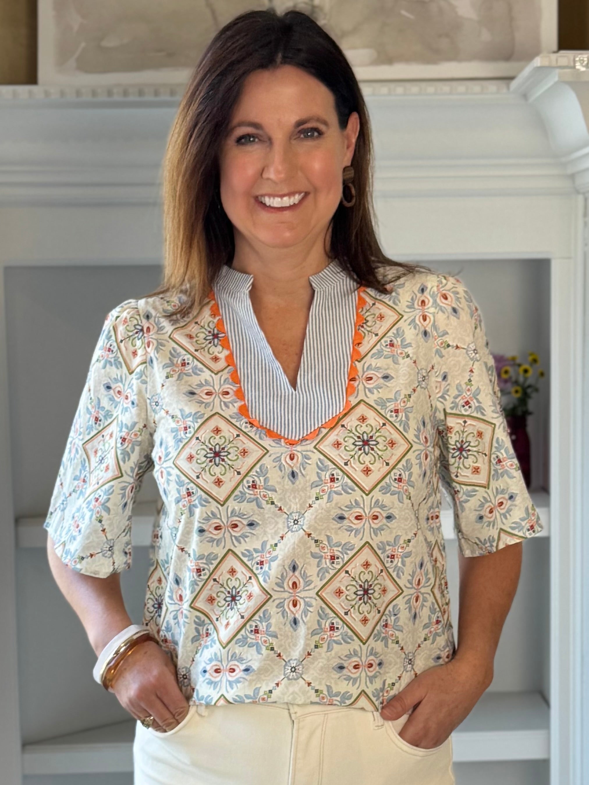 - Versatility: Pair it with denim for weekend outings, style it with white or ecru pants for a bright, fresh look, or wear it with tailored trousers for a fun casual-chic moment. It would pair well with a blazer also. A cheerful, easy-to-wear top perfect for every season.
