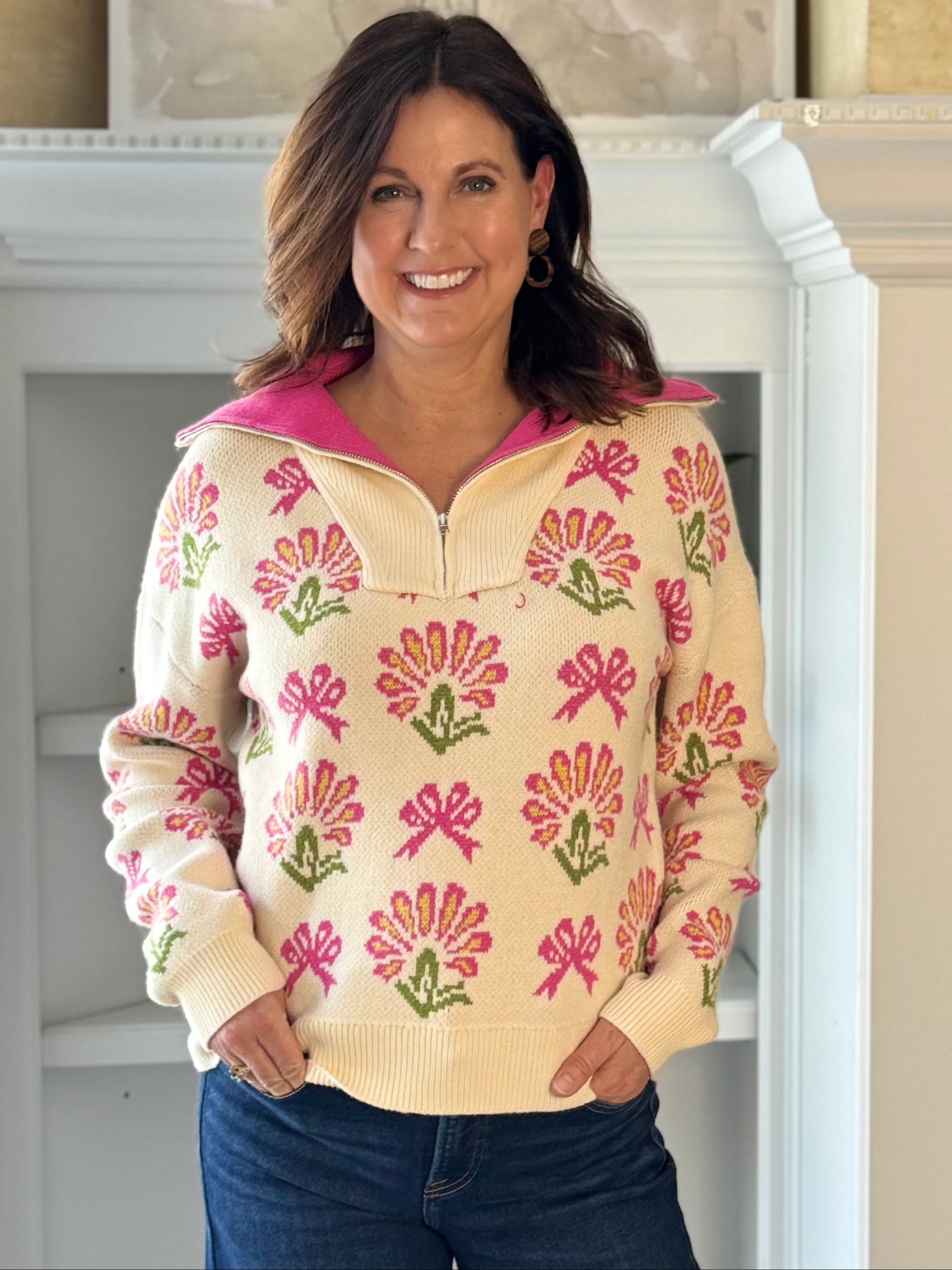 - Design: This knit top features a lively wavy pattern in candy-inspired shades of pink, orange, green, and ivory. The textured knit adds dimension, while the ivory ribbed neckline, cuffs, and hem provide a polished finish.