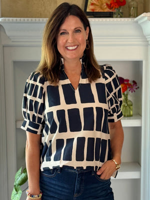 - Design: A navy & ecru top with an abstract block print, paired with short sleeves and a notched v-neckline for a polished yet modern touch.