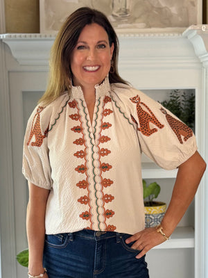 - Design: This cream textured blouse features striking embroidery in shades of burnt orange and olive, accented by playful embroidered animals on each sleeve. The scalloped embroidery down the front and the split v-neckline add texture and personality, while the short stretchy sleeves complete the look.