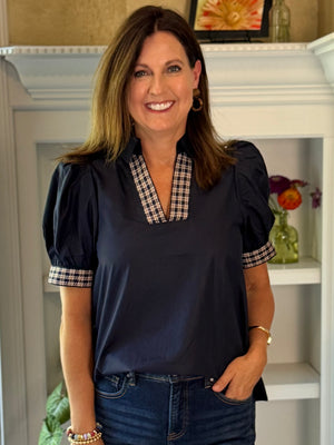 - Design: This navy top features plaid tweed trim at the neckline and sleeve cuffs for a polished contrast. Short puff sleeves and a v-neckline with a collar keep the look modern.
