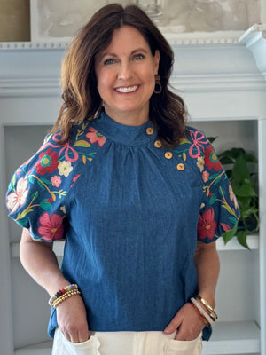- Design: This rich blue denim top features short bubble sleeves adorned with high-quality, detailed floral embroidery in vibrant hues, creating beautiful texture and dimension throughout. The denim body provides a striking contrast to the embroidered sleeves, while the neckline is finished on the side front with four button accents for an elevated, polished look.