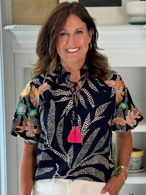 - Design: A stunning navy top adorned with a dotted leaf pattern paired with short puff sleeves embroidered in shades of pink, orange, green, and blue. A slightly higher split neckline and pink tassel ties add the perfect finishing touches.