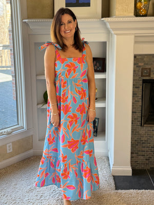 - Details: Adjustable tie shoulders, stretchy bodice, tiered skirt, partially lined, and a flowy fit for easy movement.