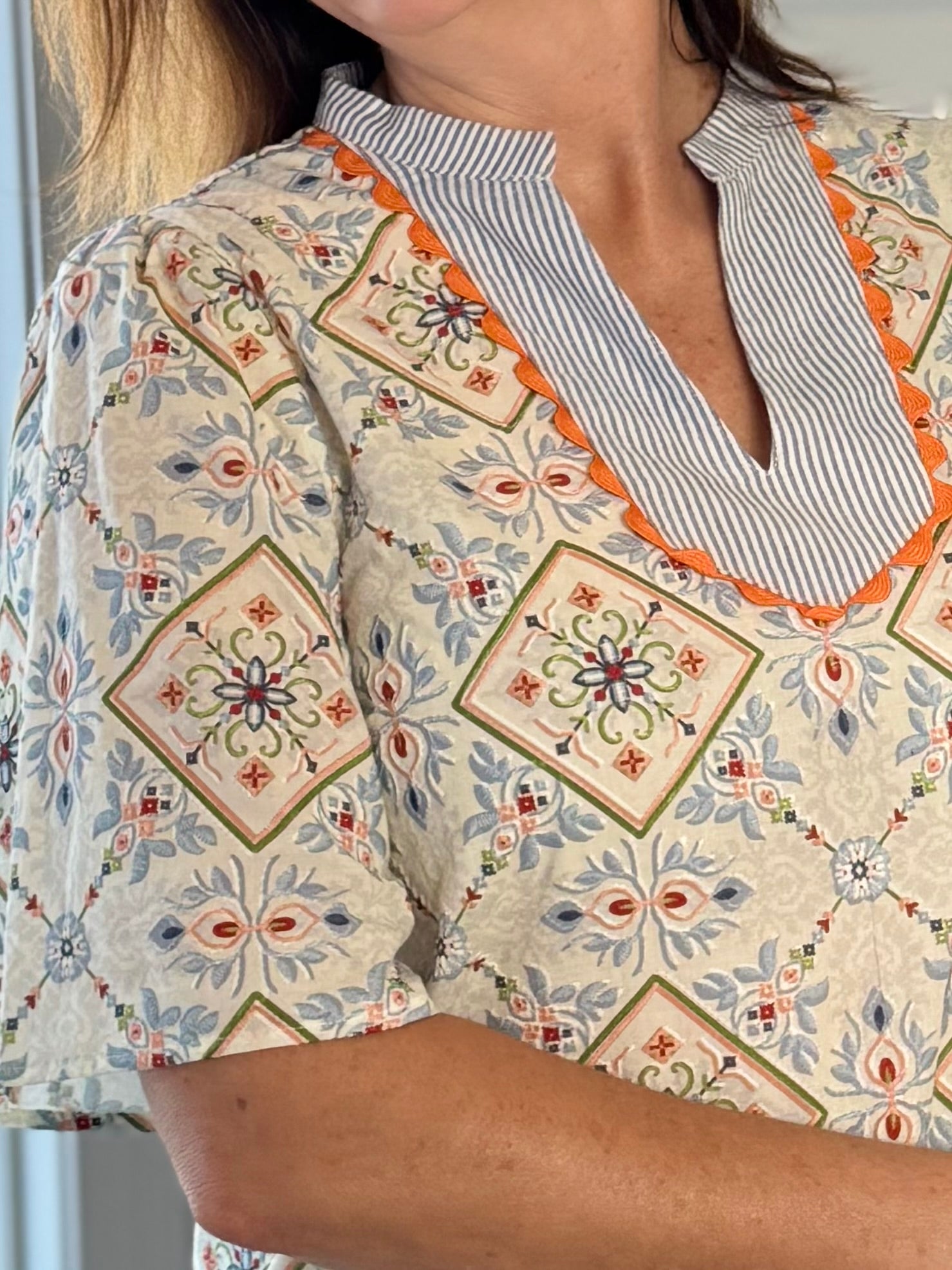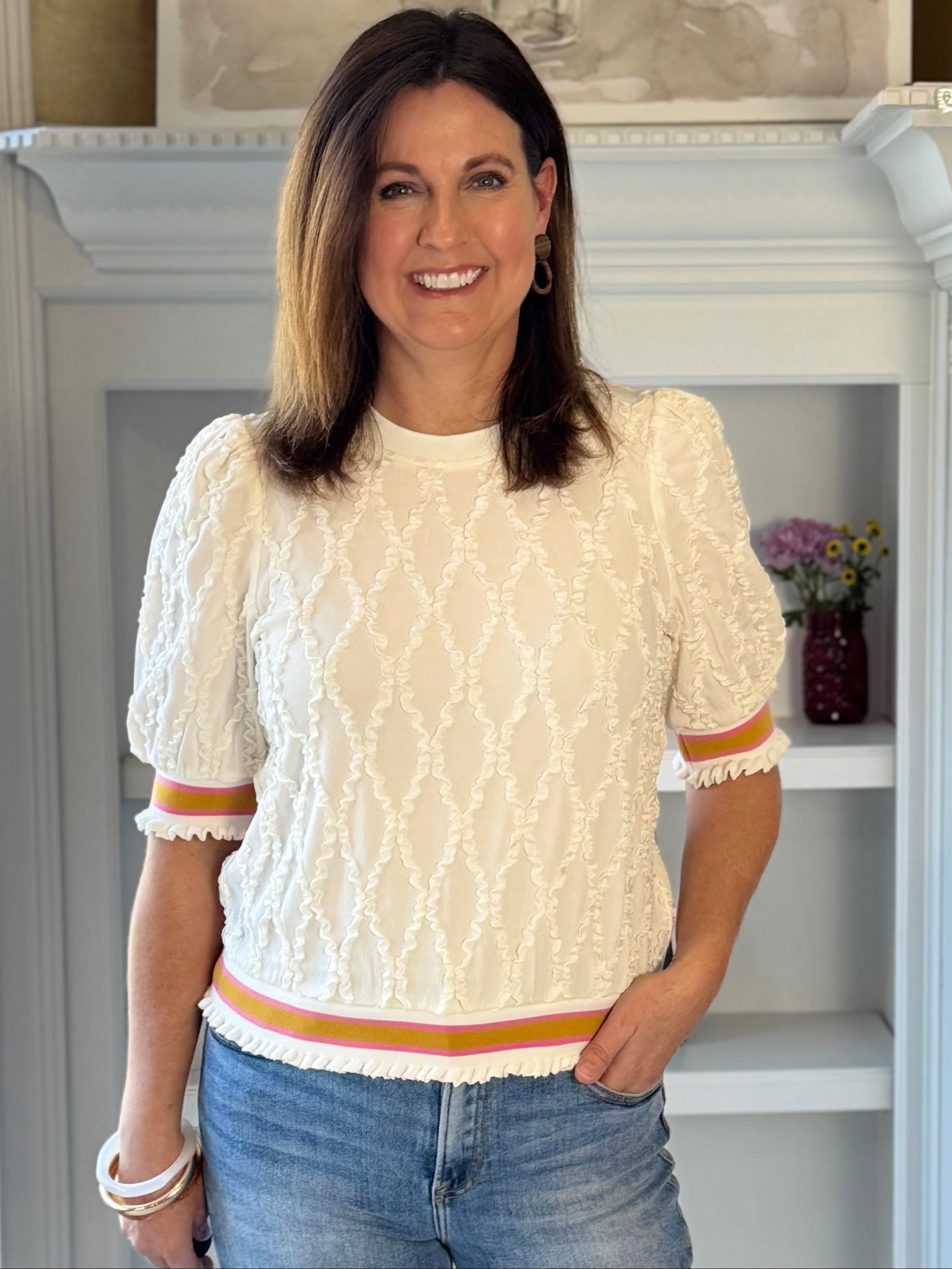 - Versatility: Pair it with denim for weekend outings, style it with white or ecru pants for a bright, fresh look, or wear it with tailored trousers for a fun casual-chic moment. It would pair well with a blazer also. A cheerful, easy-to-wear top perfect for every season.